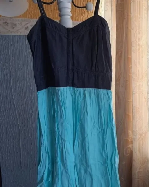 Vestido bicolor de tirantes, la parte superior de mezclilla delgada y la inferior de tela azul más clara. Sin detalles, solo se utilizo una vez . Tiene elástico en la parte de la espalda.