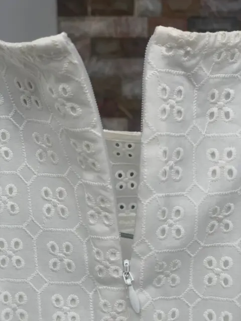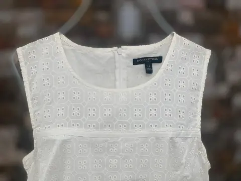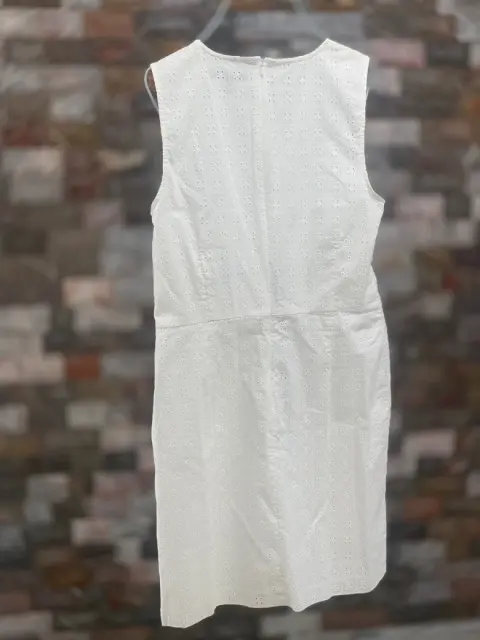Vestido sin mangas cuello redondo. Cierre por atras.SIN ESTRENARMarca: Banana RepublicColor: BlancoTalla 14Medidas:-De hombro a hombro: 35 cms-De sisa a sisa: 50 cms-De cintura: 47 cms.-De largo: 92 cms.Es de tela troquelada con fondo blanco para que no se trasparente.Ideal para una boda por el civil, bautizo, fiesta de cumpleaños, etc!Ya viste más modelos de Vestidos en mi perfil?... Si te gustan varios avísame y te hago un descuento especial!Escríbeme para cualquier duda!