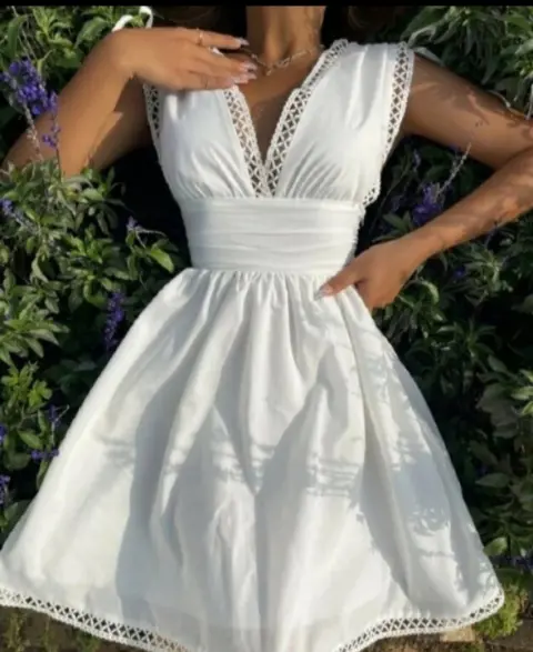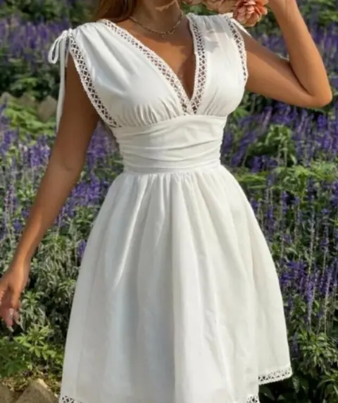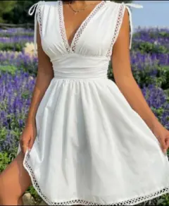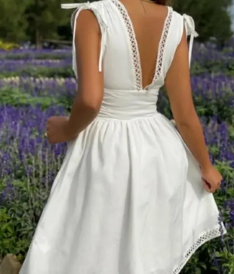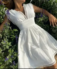 Vestido blanco liso, con calado en las mangas, y en el vuelo de la falda, con cierre a un costado, con escote en V y sin mangas.