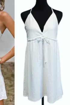 Vestido blanco calado. Vestido blanco corto de tirantes calado, los tirantes son ajustables, viene con cinto para ajustar debajo del busto, la tela es un poco elastica, tela poliester tipo licra, viene con forro.Medidas:Axila a axila: 59 cmLargo: 100 cm (sin ajustar el tirante)elastico debajo del busto: 106 cm sin ajustar