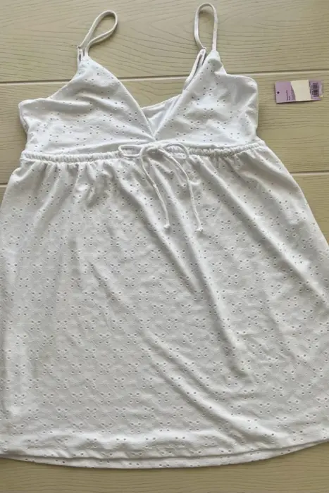 Vestido blanco corto de tirantes calado, los tirantes son ajustables, viene con cinto para ajustar debajo del busto, la tela es un poco elastica, tela poliester tipo licra, viene con forro.Medidas:Axila a axila: 59 cmLargo: 100 cm (sin ajustar el tirante)elastico debajo del busto: 106 cm sin ajustar