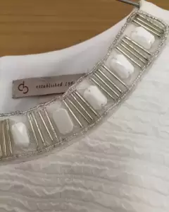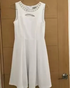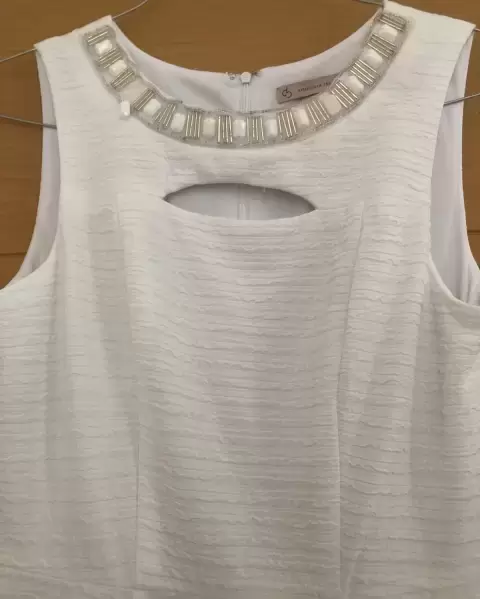 Vestido blanco con adorno bordado talla 10. Vestido blanco stretch cuello redondo bordado en blanco y plata en línea A , talla 10 marca CD style