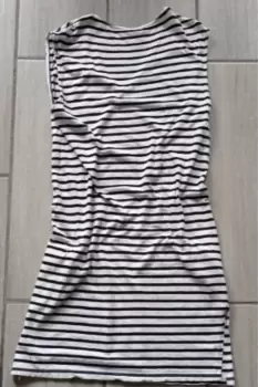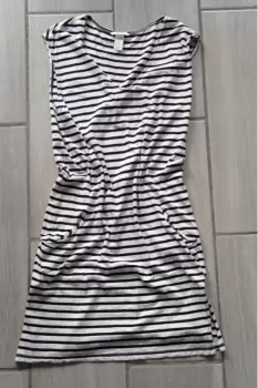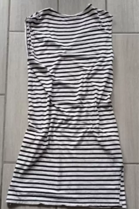 Vestido blanco con rayas negras-H&M. Vestido básico casual largo, blanco con rayas negras. Sin mangas.Excelente para uso diario, casual, formal. ✨Nuevo, talla S da hasta L, es o OversizeCuello VExcelente estado y calidad ✨