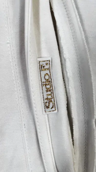 Vestido blanco, estudio F, con escote en la espalda forma en V, hermosa caída de princesa, tiene un poco manchado de las axilas