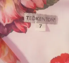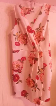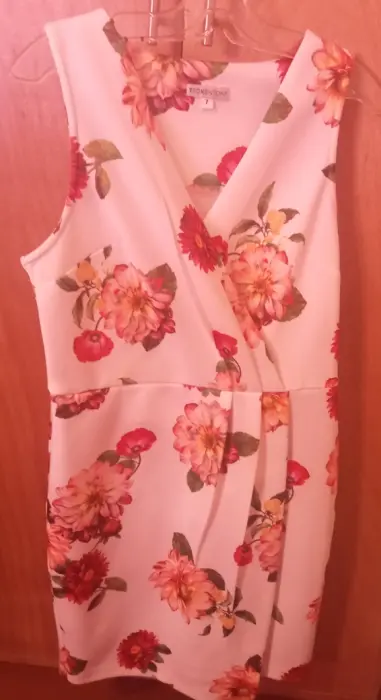 Vestido blanco con estampado de flores grandes, talla chica, es corto y ajustable al cuerpo.