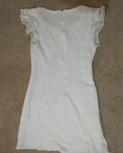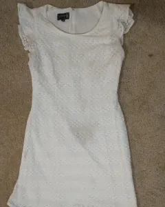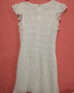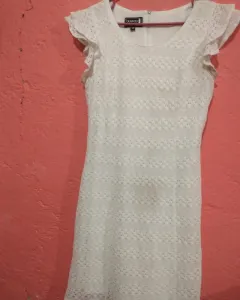 Vestido blanco Ivonne. Vestido blanco, marca Ivonne con olanes en el hombro, talla 10. Tiene como detalle una mancha en la parte delantera.