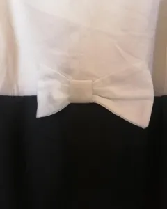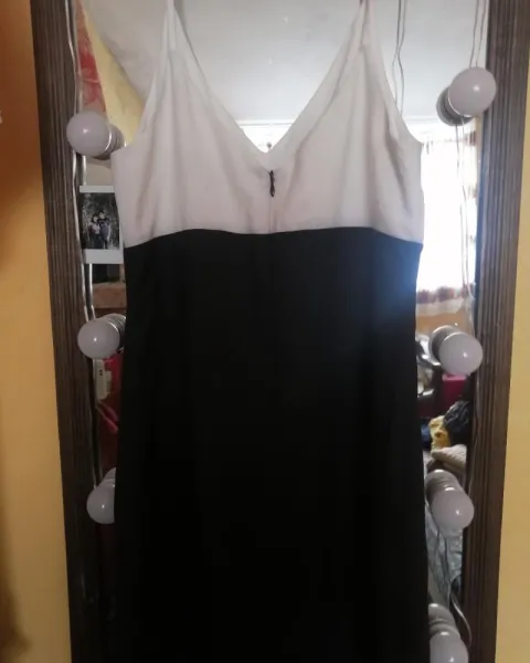 Vestido de dos colores blanco y negro. Tela delgada y ligera. Tirantes delgados y escote en V. Detalle de moño delantero. Cierre invisible trasero. No se que marca es. Talla L.Medidas:86 cm bustoCintura: 75 cm cinturaLargo: 39 cm