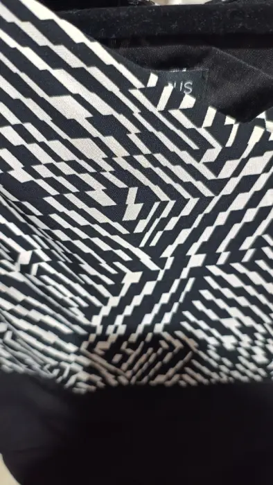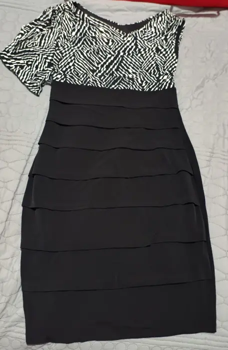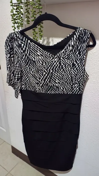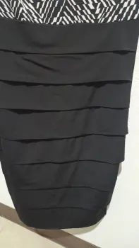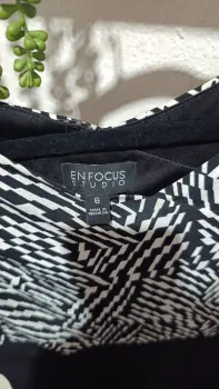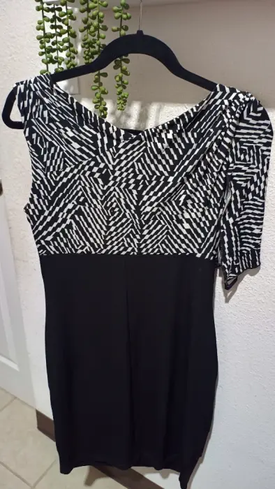 Vestido Blanco y Negro. Lindo vestido, corte recto, talla 6, hermoso detalle de manga abierta y caída, contrario a la otra en forma de tirante grueso. Medidas:Largo. 90 cmAxila. 40 cmHombro. 37 cmCintura 36 cmCadera. 46 cm