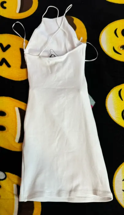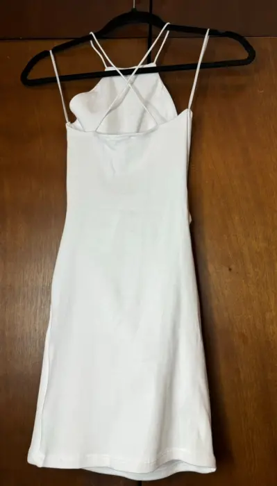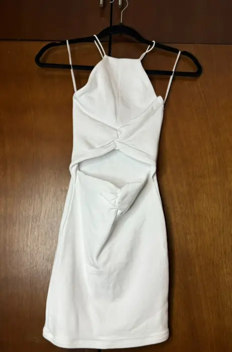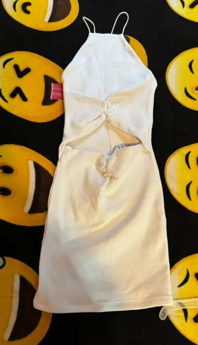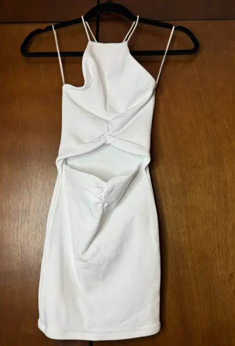 Vestido blanco, escote en la espalda, abierto en la parte del abdomen, corto, nuevo, con etiqueta, Talla: Chico.