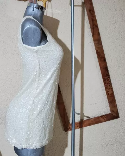 Vestido de fiesta muy elegante, trae forro y encima malla con lentejuela tejida en todo el vestido con hilo de seda.Material: 100% poliéster y trae un ligero spandex en el forro.Color: IvoryTalla: SDetalles: lo muestro en foto, esta ubicado en el forro y no se ve para nada.