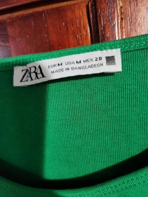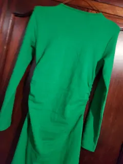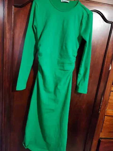 Vestido zara body con verde perico, talla m con drapeado en la cintura midi.Manga larga. Tela elastica.