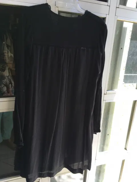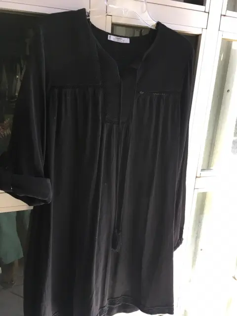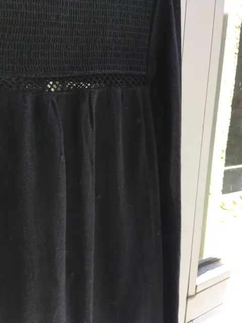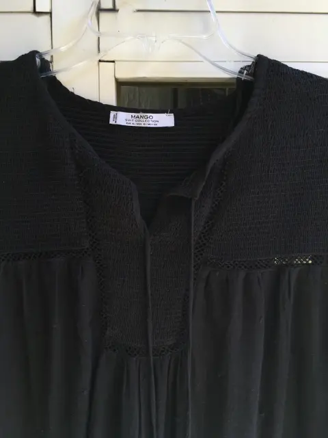Lindo vestido boho negro con lunares tejidos en hilo satinado. Las fotos no le hacen justicia. Un súper must. Completamente nuevo. Medidas: hombros 42cm, axilas 62cm, cintura 67cm, cadera 70cm, largo 91cm. La parte superior está elastizada.