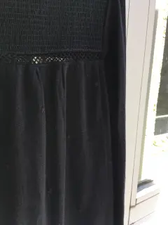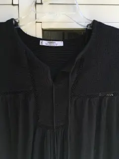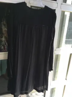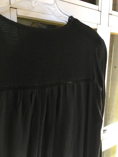 Vestido boho negro. Lindo vestido boho negro con lunares tejidos en hilo satinado. Las fotos no le hacen justicia. Un súper must. Completamente nuevo. Medidas: hombros 42cm, axilas 62cm, cintura 67cm, cadera 70cm, largo 91cm. La parte superior está elastizada.