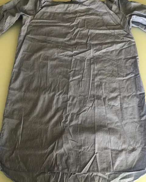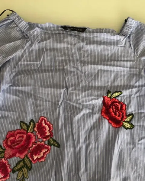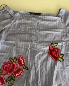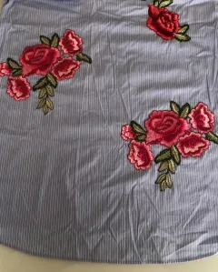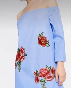 Vestido bordado. Vestido camisero corto, a rayas, azul claro, hombro descubierto / strapless, manda 3/4, con bordado de flores