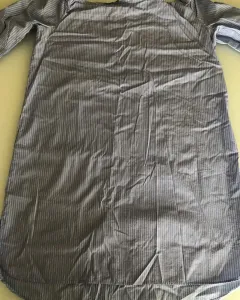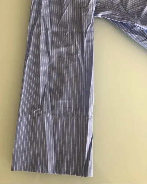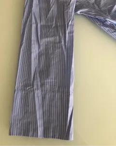Vestido camisero corto, a rayas, azul claro, hombro descubierto / strapless, manda 3/4, con bordado de flores