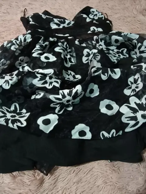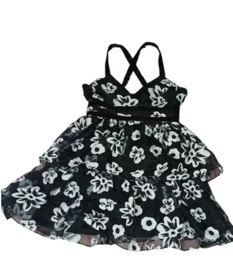 Vestido brunna floreado. Elegante vestido BRUNNA, de tela negra con flores blancas transparente y gorro negro, tiene cierre y tirantes cruzados en la parte trasera, es talla M, se usó 2 veces está en perfecto estado, perfecto para una fiesta