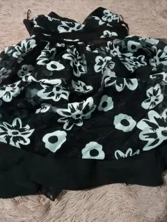 Elegante vestido BRUNNA, de tela negra con flores blancas transparente y gorro negro, tiene cierre y tirantes cruzados en la parte trasera, es talla M, se usó 2 veces está en perfecto estado, perfecto para una fiesta