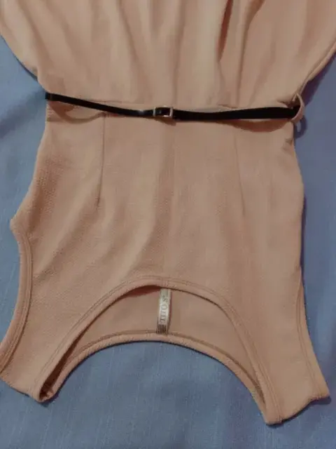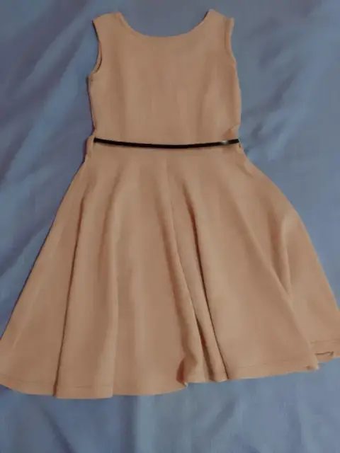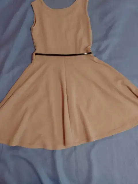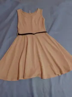 Hermoso vestido color café claro, sin manga, cuello redondo, tiene cintillas para poder usarlo con cinturón. A pesar de ser unitalla queda muy bien para alguien talla M o G. Tiene bastante vuelo y una hermosa caída. Se vende sin el cinturón