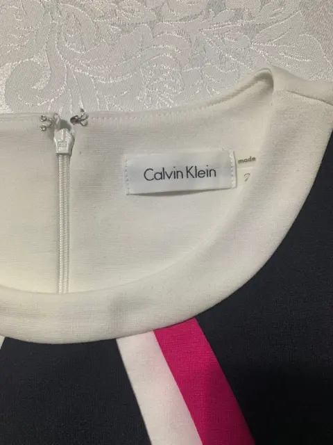 Vestido Calvin Klein. Hermoso vestido corte princesa, sin mangas, cuello redondo, cierre oculto en la espalda y con un delgado cinturón sintético.Tela de poliéster con rayón. (Estira con firmeza).Medidas/ espalda: 31 cm, cintura: 40 cm, cintura: cintura; 35 cm, cadera: 40 cm, largo: 93 cm.