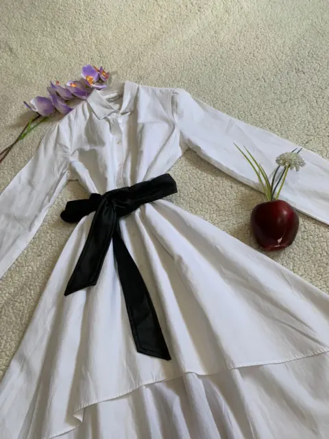 Puedes ponerle un cintó para que se vea más hermoso, tiene 48 cms de ax ax , solo tiene. Una pequeña manchita en el cuello que puedes apreciar en la fotp