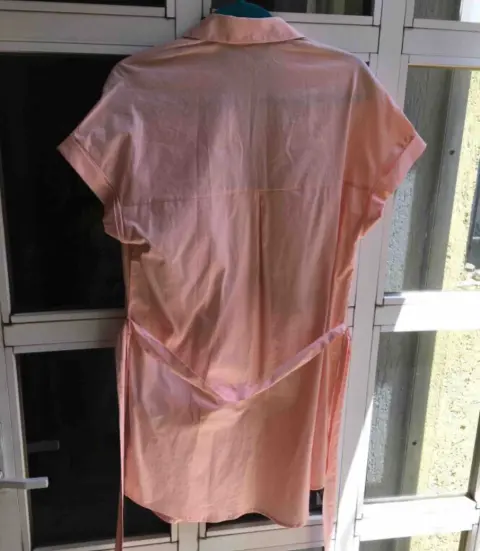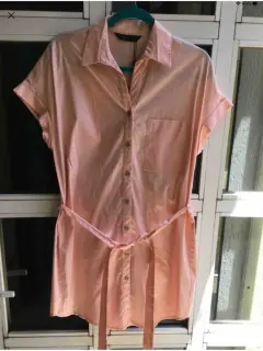 Bonito vestido camisero de algodón en color coral. Nuevo y con etiqueta. Medidas: axilas 54cm, cintura 54cm, cadera 56cm, largo 88cm.