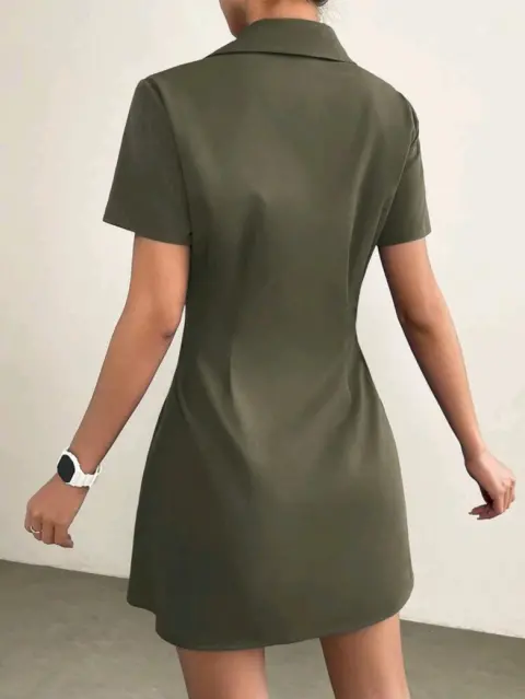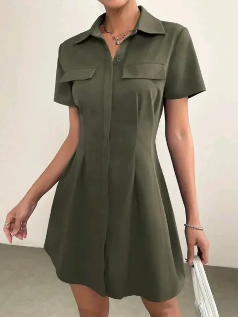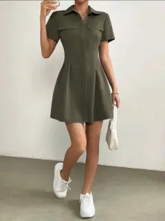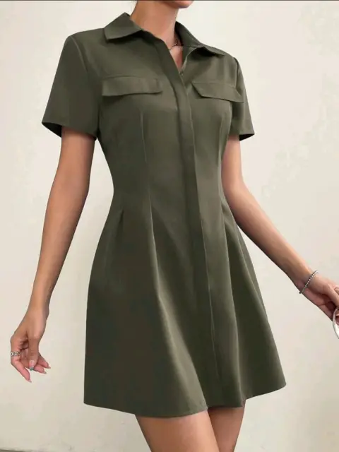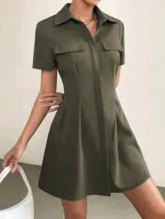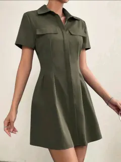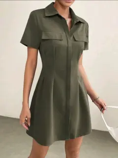 Vestido camisero con diseño de solapa. Vestido corto verde militar, manga corta en perfecto estado 100% poliesterHombro 42Largo 88Pecho 107