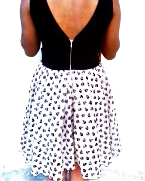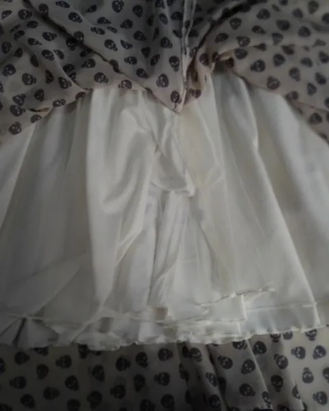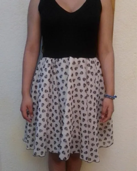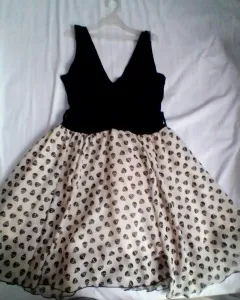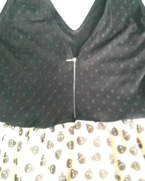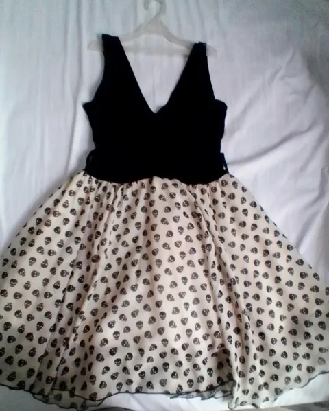 Vestido casual. Vestido casual en beiges y negro tiene estampado tanto en la partes de arriba como abajo arriba tiene estampado de puntos color grises y abajo con calaveras de color negro