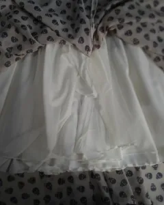 Vestido casual en beiges y negro tiene estampado tanto en la partes de arriba como abajo arriba tiene estampado de puntos color grises y abajo con calaveras de color negro