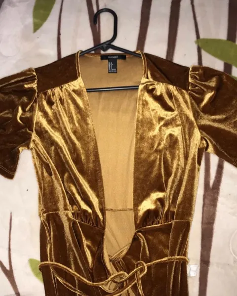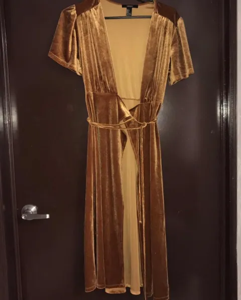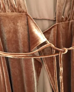 Vestido corte medio, de terciopelo color camel con destellos en tono oro.