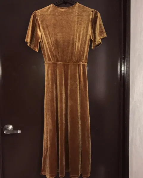 Vestido casual. Vestido corte medio, de terciopelo color camel con destellos en tono oro.