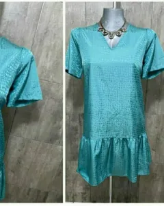 Lindo vestido casual, color verde aqua, tela satinada y con detalles grabados, bolsillos laterales.