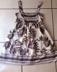 Vestido casual con tirantes grueso, estampado en flores y rayas cafe con beige. Talla L Ojo tiene un detalle en la parte de abajo, se corrio un poco pero de lejos no se nota.