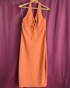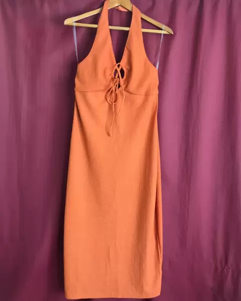 Vestido casual. Vestido casual color marrón o ladrillo, corte halter con detalle en el escote del frente, abertura en la parte de atrás, nuevo sin etiqueta me perfecto estado
