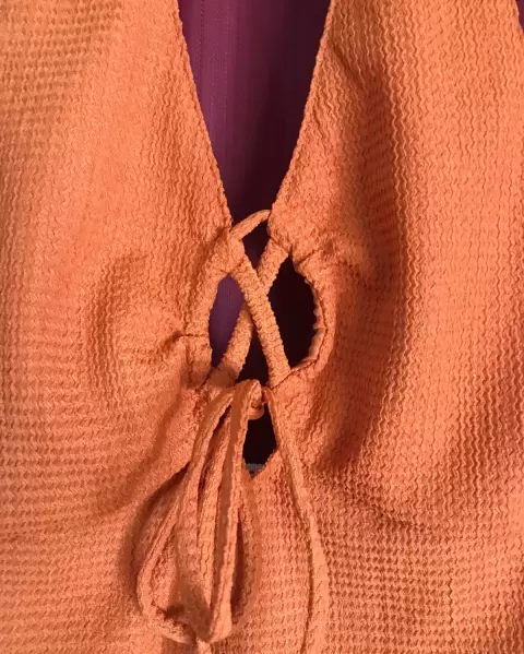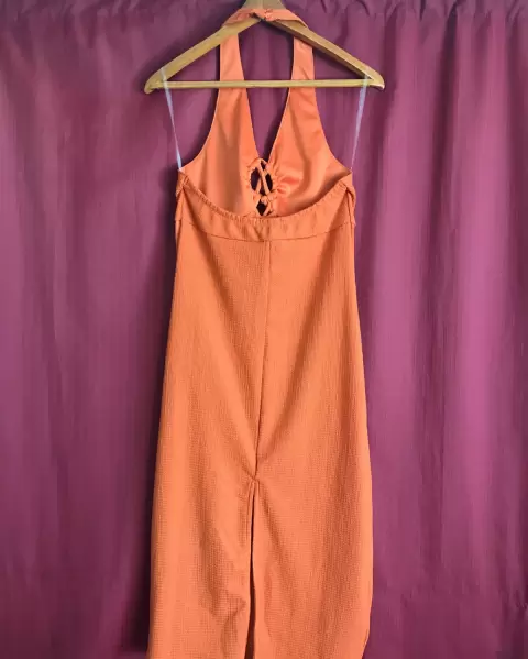 Vestido casual color marrón o ladrillo, corte halter con detalle en el escote del frente, abertura en la parte de atrás, nuevo sin etiqueta me perfecto estado