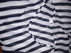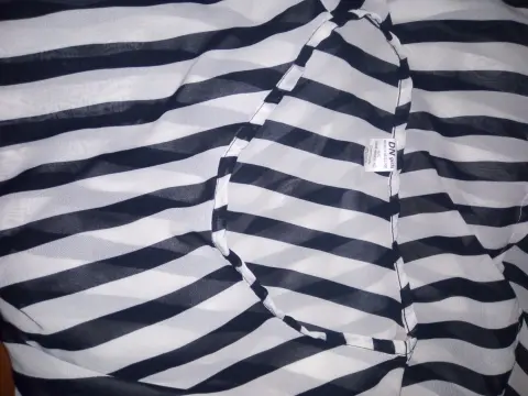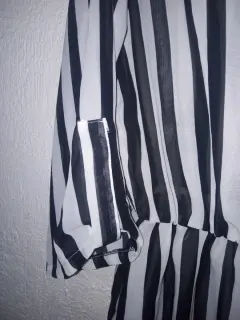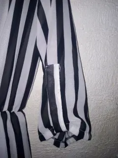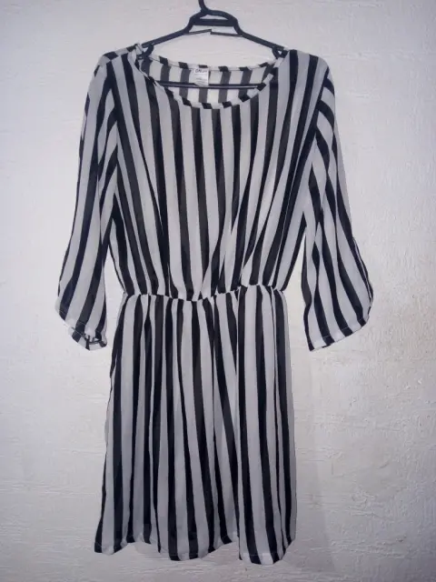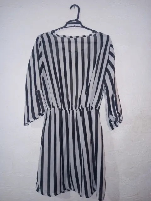 Vestido casual a rayas transparente en blanco y negro, manga 3/4. Tela y costura en buen estado. De axila -axila 110 cm y de largo 88 cm. En la cintura tiene resorte.