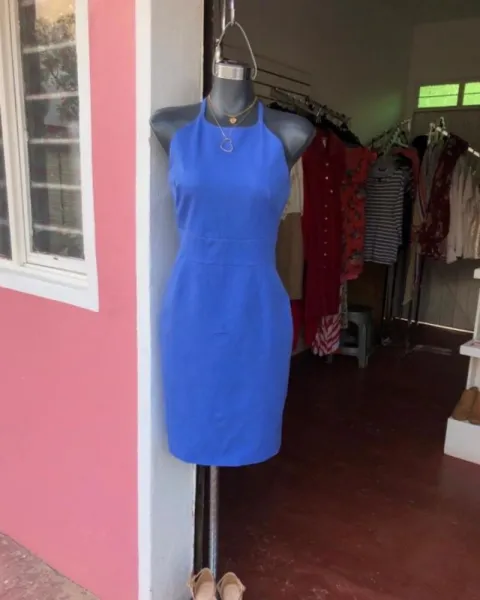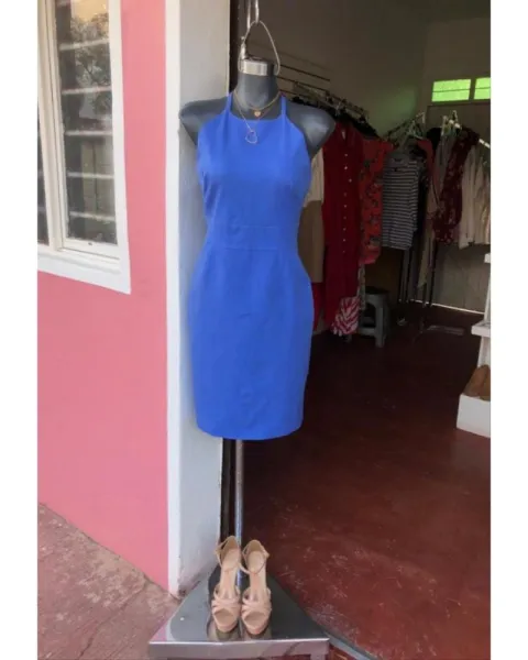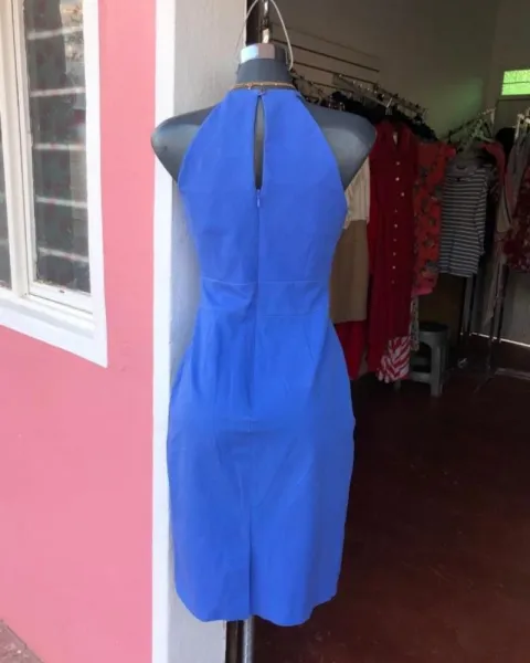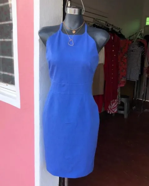 Hermoso vestido de cuello tipo halter, de tela strech, queda ajustado, es en color azul claro, en talla S.