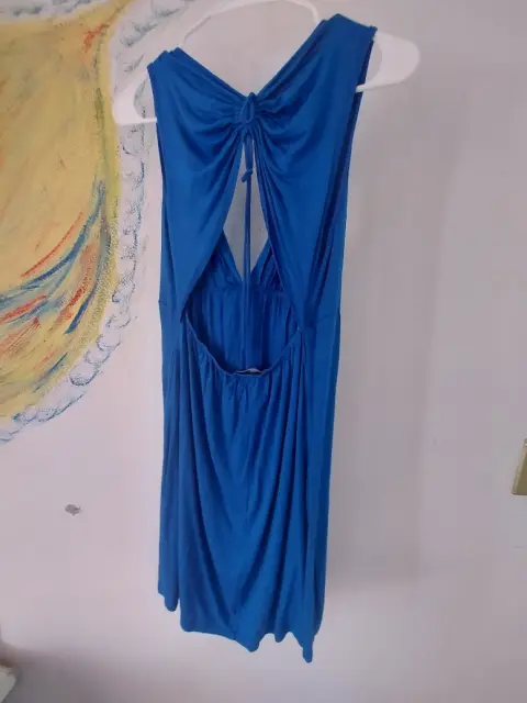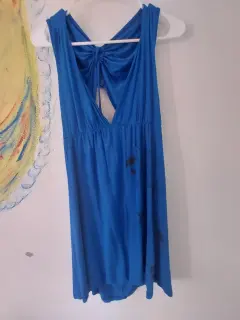 Vestido casual azul. Vestido azul, tela fresca, espalda descubierta, estampado floral en color negro. También se puede usar como bluson. Uso casual o informal