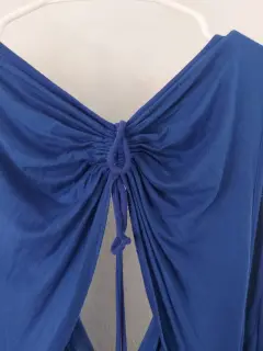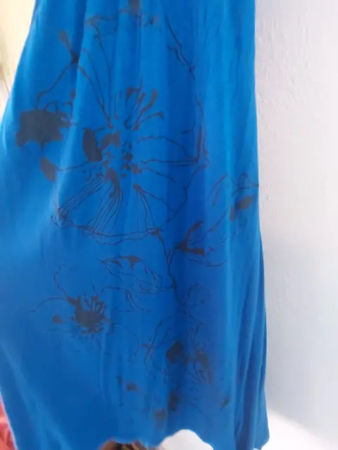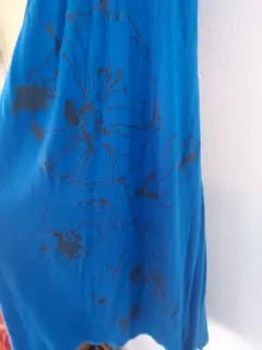 Vestido azul, tela fresca, espalda descubierta, estampado floral en color negro. También se puede usar como bluson. Uso casual o informal