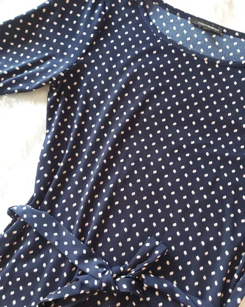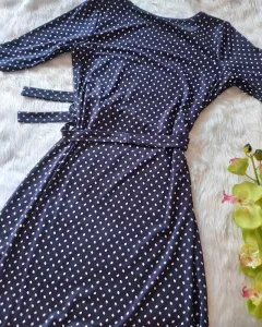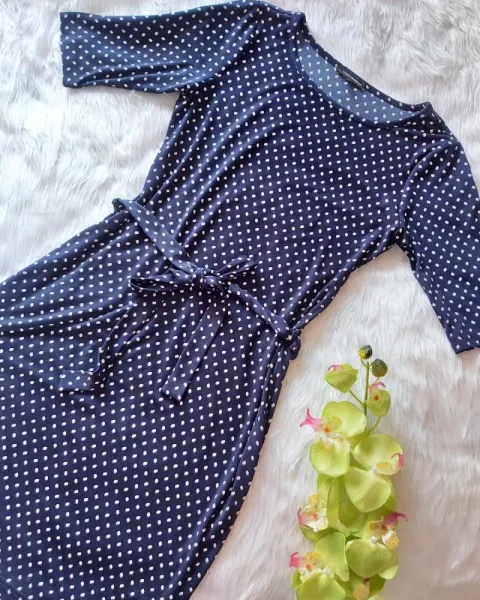 Vestido casual azul con lunares blancosSuper bonito tiene cinturon para acentuar la cinturaLa tela es suave y frescaLlega un poco abajo de la rodilla