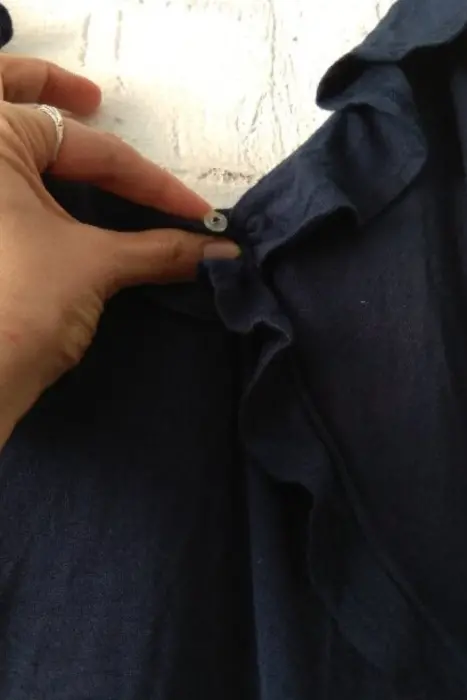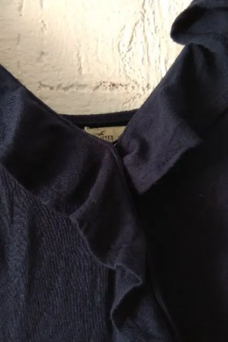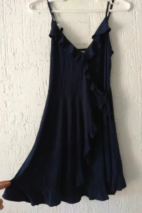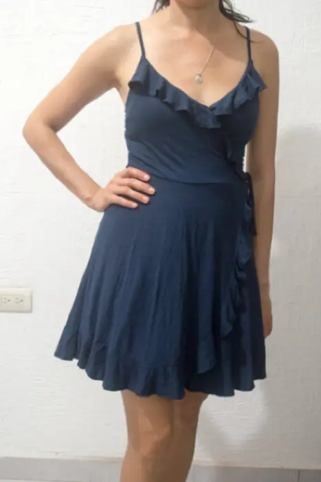 Vestido casual azul marino con olanes.HollisterCintura 54cm pero se estira la tela.Largo 85cm del hombro hasta abajo95% algodon, 5% poliestilenoTiene un botón pequeño por dentro donde se une el pliego de en frente. Se ve en la foto. Pero cuando lo usas no se ve el botón. Solo lo ves si lo tienes puesto y miras hacia abajo.No tiene detalles. No tiene nada rotó ni manchas.