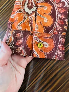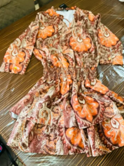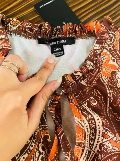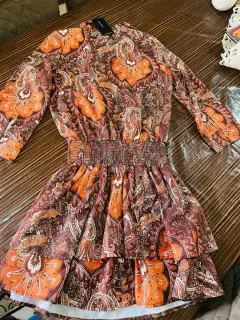 Vestido café con detalles en color naranja , con resorte en la cadera y falda volada, no es pegado