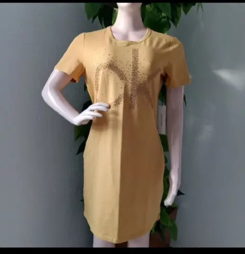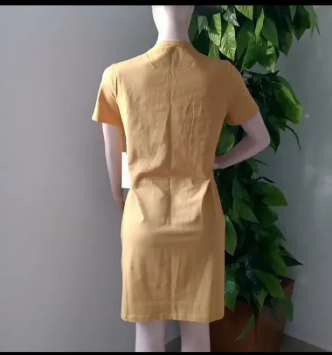 Bonito vestido color mostaza. Manga corta. Logotipo de la marca con inscrustaciones color beige/dorado. Color sólido, moderno y elegante.Talla M (queda a L también)Hombro a hombro: 40cmAxila a axila: 50cmLargo desde hombro: 90cmMaterial:👉95% algodon👉5% spandexMarcas originales importadas de USA.