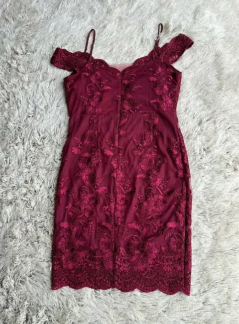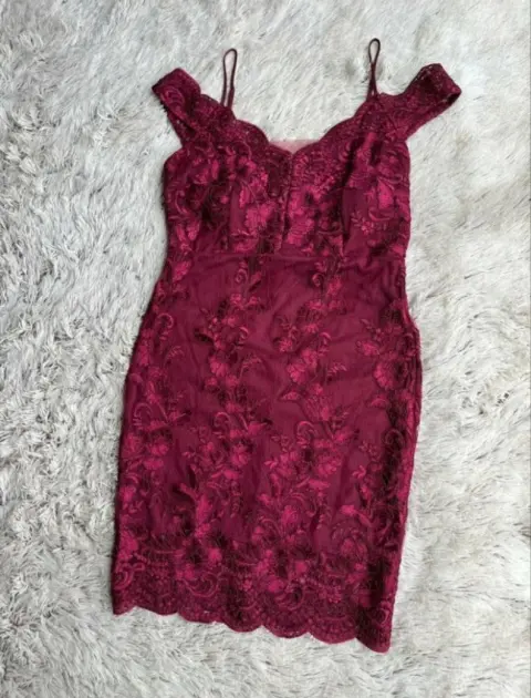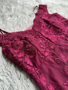Lindo vestido color vino, casual corto, con encaje y transparencia, con forro, manga caída y tirantes, cierre en la parte de atrás, que hace muy bonita figura.Talla: LMedidas axila a axila:Cintura:Largo:
