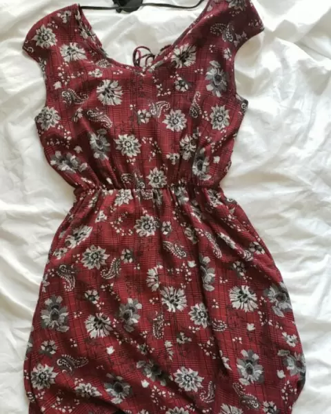 Vestido corto casual con agarre en cintura.Mis medidas son pecho: 95, cintura: 78, cadera: 108, mido 170 y me queda un poco abajo de nalgas. No tiene ningún detalle.