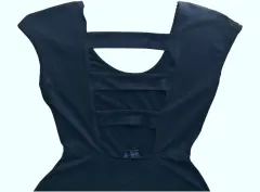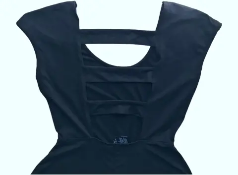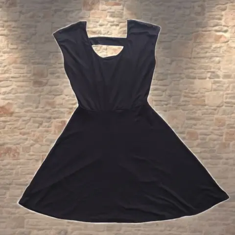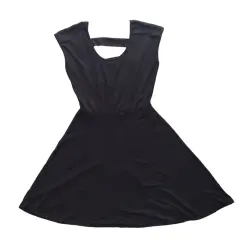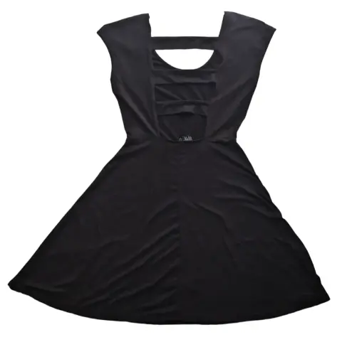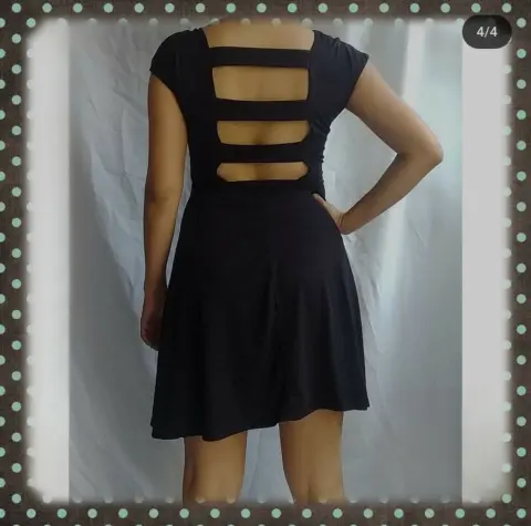 Vestido negro, marca Rue 21, talla M. En la parte de la espalda tiene aberturas que lo hacen muy fresco y lindo, estira.95% poliéster, 5% spandex.Hombro a hombro: 45 cm.Largo total: 84 cm.Axila a axila: 39 cm.Cintura 30 cm.