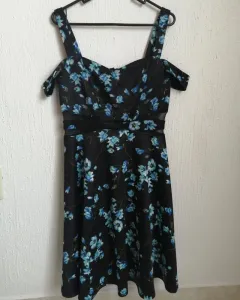 Vestido Casual de Dama Liz Minelli. Vestido Casual Talla chica, aunque viene un poco amplio puede dar a talla mediana, es color negro con estampado de flores en color azul, cuenta con transparencia en la parte de en medio y doble tirante, el segundo se usa como timo manga caída.