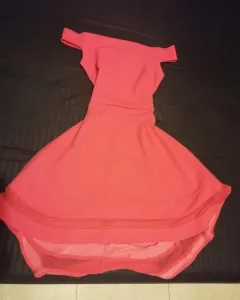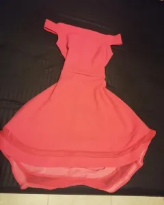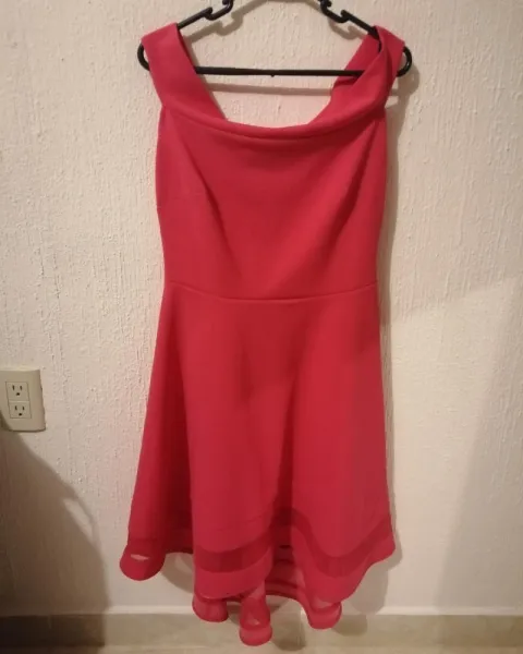 Vestido Casual de Dama Liz Minelli, color rosa, talla chico, las mangas quedan a los lados por debajo del hombro y es un poco más largo de atrás con cola estilo pato.