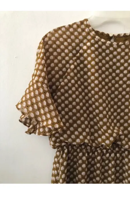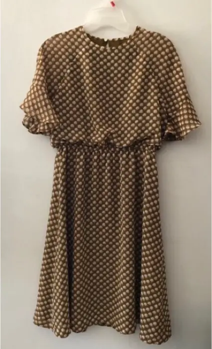 Hermoso vestido primaveral. Talla Xs pero también queda a una S. Elegante y fresco, tela de casa con forro, cintura elástica, hombro caído y manga tipo capa. El color es café clarito con figuritas en color rosa bebé y blanco y puntitos negros. Esta bellísimo