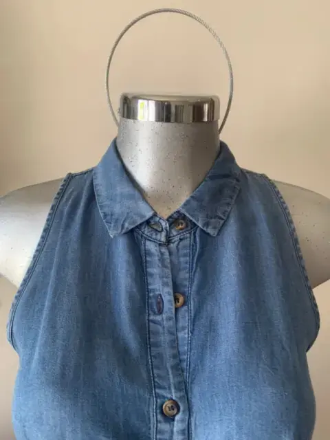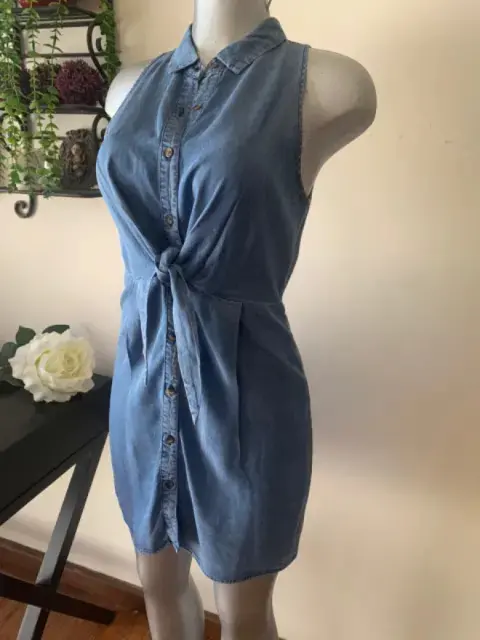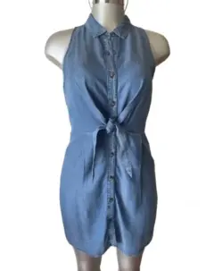 Vestido casual de mezclilla talla. Vestido corto, casual de mezclilla delgada. No transparente. Tiene 2 cordones cortos de la misma tela al frente para amarrarse. Es un poco mas largo por atrás como se muestra en las fotos. talla M. Mide 84 cm de largo por enfrente, y 89 cm de largo por atrás. Marca Sienna Sky. Usado una sola vez.