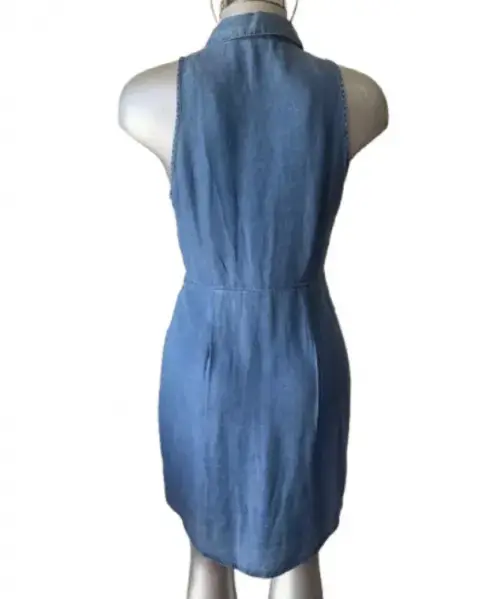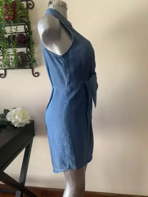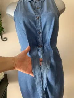 Vestido corto, casual de mezclilla delgada. No transparente. Tiene 2 cordones cortos de la misma tela al frente para amarrarse. Es un poco mas largo por atrás como se muestra en las fotos. talla M. Mide 84 cm de largo por enfrente, y 89 cm de largo por atrás. Marca Sienna Sky. Usado una sola vez.